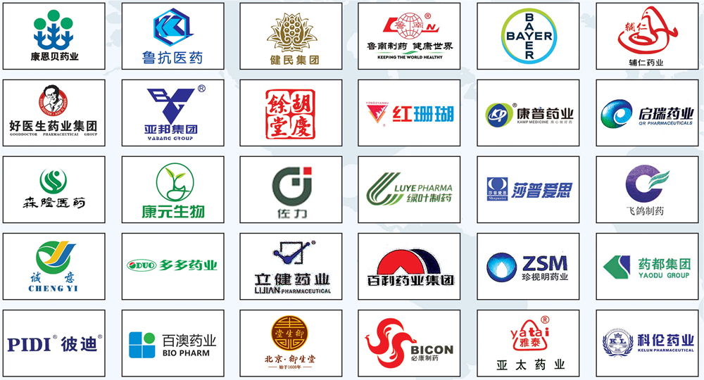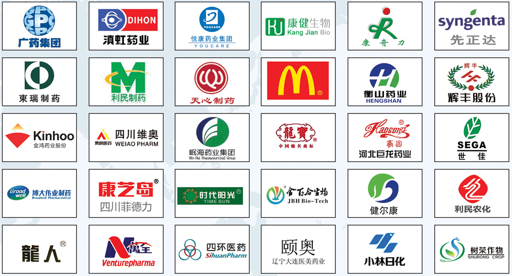 多年來公司始終以“誠信、互惠、優(yōu)質(zhì)、價(jià)廉、快捷”的服務(wù)理念贏得了國內(nèi)外廣大用戶的信賴和贊譽(yù)。產(chǎn)品暢銷全國合作企業(yè)有浙江康恩貝、武漢健民集團(tuán)、好醫(yī)生集團(tuán)、四川科倫制藥、魯南制藥、魯抗醫(yī)藥、哈藥集團(tuán)、仲景宛西制藥、揚(yáng)子江藥業(yè)集團(tuán)、國藥集團(tuán)馮了性藥業(yè)、四川依科制藥、山西同達(dá)藥業(yè)、先正達(dá)作物保護(hù)、鹽城利民農(nóng)化、江蘇輝豐農(nóng)化、湖北百科亨迪制藥、藥都制藥集團(tuán)、黃石燕舞藥業(yè)、浙江遠(yuǎn)力健藥業(yè)、浙江佐力藥業(yè)、上海美優(yōu)制藥、輔仁藥業(yè)集團(tuán)、浙江莎普愛思藥業(yè)、杭州胡慶余堂藥業(yè)、廣西一力制藥、蘇中藥業(yè)集團(tuán)、白云山東泰商丘制藥、山東正大制藥、陜西漢唐制藥、河南金鴻堂制藥、源合盛(吉林)藥業(yè)、河北奧星制藥、上?,F(xiàn)代哈森(商丘)藥業(yè)、西安博愛制藥、廣東紅珊瑚藥業(yè)、山西皇城相府藥業(yè)、成都森科制藥、甘肅西峰制藥、悅康藥業(yè)集團(tuán)、河南羚銳制藥、山東綠葉制藥、江蘇岷海制藥、南昌立健藥業(yè)、四川維奧藥業(yè)、四川百草堂龍人藥業(yè)、珠海金鴻制藥、安徽先鋒制藥、廣東彼迪藥業(yè)有限公司、廣東百澳藥業(yè)有限公司、吉林四環(huán)醫(yī)藥、吉林華康藥業(yè)、黑龍江多多藥業(yè)、黑龍江全樂制藥、吉林博大偉業(yè)制藥、青海寶鑒堂制藥、南通精華制藥、山西奧邇藥業(yè)、山西千匯藥業(yè)、安琪酵母等。并出口亞、非、歐、美等三十多個(gè)國家和地區(qū)。